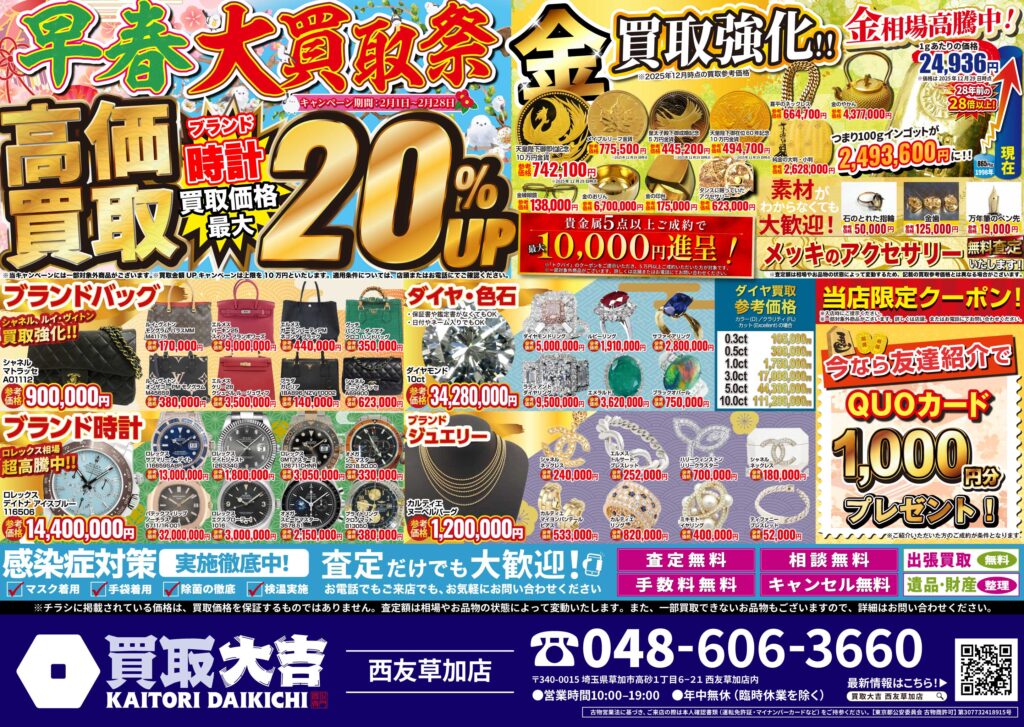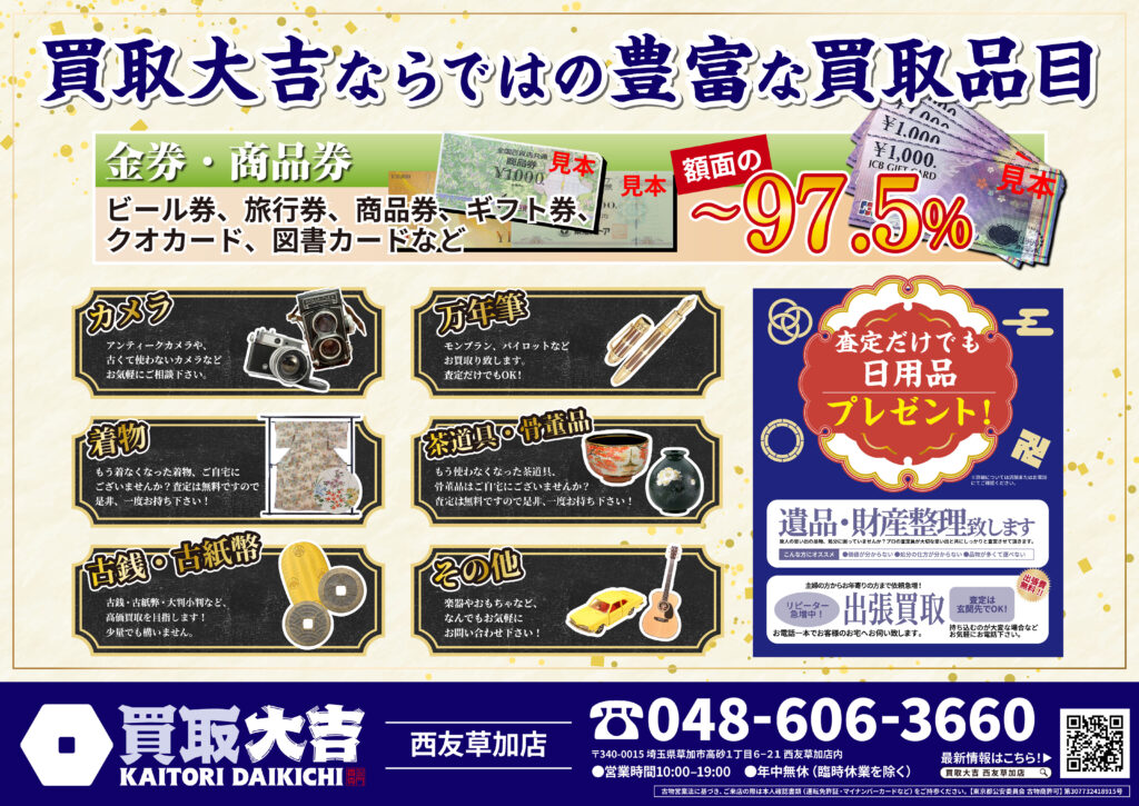 キャンペーン実施店舗 よくあるご質問 買取価格は主にどんな要素から決まるのでしょうか? お品物の状態や付属品の有無、最新相場、流通量などによって買取価格を算出します。 どんなものを買い取ってもらえますか? 金・貴金属・ブランド品はもちろん、お値段がつくか迷われているものも是非お持ちください。 傷や汚れのあるアイテムでも買取可能ですか? 大歓迎です。未使用品などのお持ち込みは少なく、傷や汚れのあるアイテムをお持ちいただく方が半数以上です。状態の悪いお品物やカビなどがあってもお買取可能なケースもございます。 どんな情報があればすぐに査定額を教えてもらえますか? お品物の名前や種類、状態、またはブランド名、型番などの情報があると、概ねの査定額をお伝えできるかと思います。 店舗での査定時間はどのくらいですか? お品物の種類や個数にもよりますが、約5分から30分ほどの査定時間となるケースが多いです。事前にある程度の査定時間をお伝えいたしますので、ご安心ください。